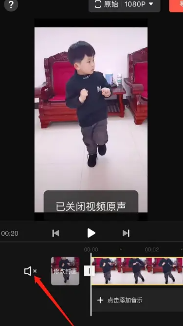 3、进入编辑界面后,点击音量按钮,此时会显示已关闭视频原声,成功将视频原声静音。