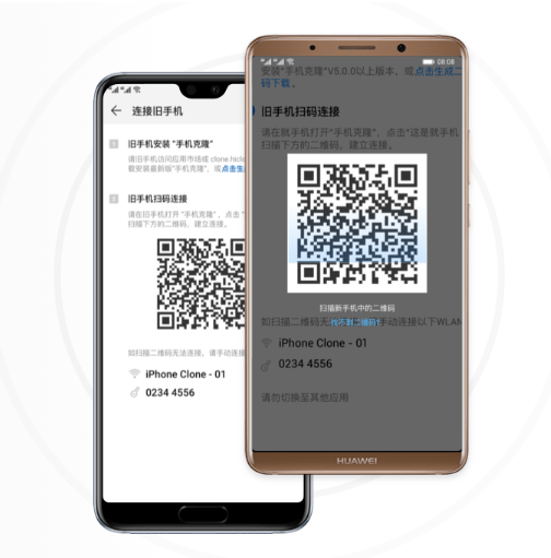 在旧设备上,进入手机克隆应用,点击迁移数据到华为手机,根据界面提示,通过扫码连接的方式,将旧设备与新手机建立连接。