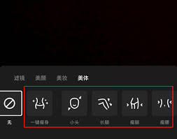 点击进入美体功能页面,你会看到多种美体效果可供选择。比如有瘦脸效果,可以让你的脸部线条更加精致;瘦腰效果,能瞬间让你的身材曲线更加优美;还有长腿效果,轻松拥有令人羡慕的大长腿。
