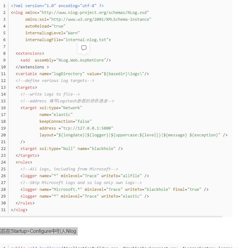 首先在你的项目中用Nuget安装以下两个类库NLog.Extensions.Logging和NLog.Web.AspNetCore然后新建NLog的配置文件Nlog.config,内容如下 :