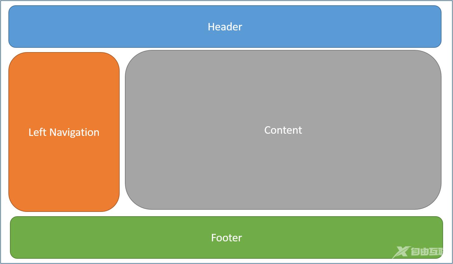布局通常包含常见的用户界面元素,例如应用头,导航或菜单元素和页脚,如图: