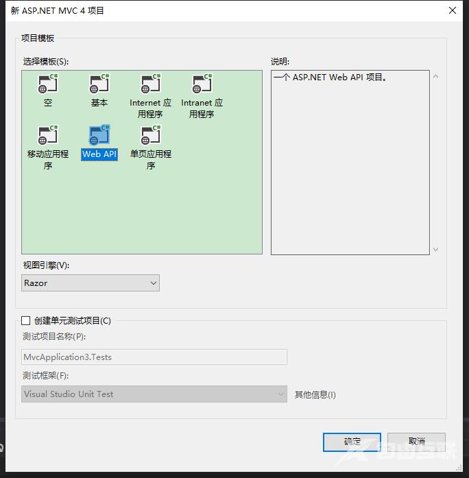 在出来的模板中选择Web API。点击确定后,就创建了一个空的WebAPI服务。