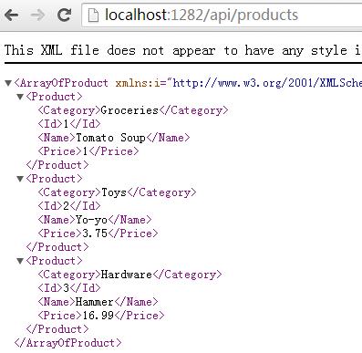 此时,我们就可以在浏览器中看到结果了(由于Controller改名字了,此时的地址就变成了api/products)