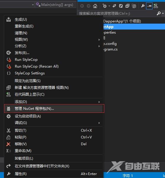 a、选择要安装的项目或解决方案,右键选项选择管理NuGet包。