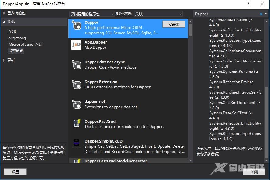 b、在搜索框内搜索"Dapper",选择安装即可。