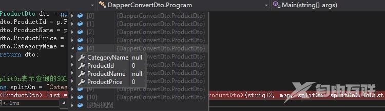 List<ProductDto> list = conn.Query< Category, ProductDetail, ProductDto>(strSql2, map, splitOn: splitOn).ToList<ProductDto>();