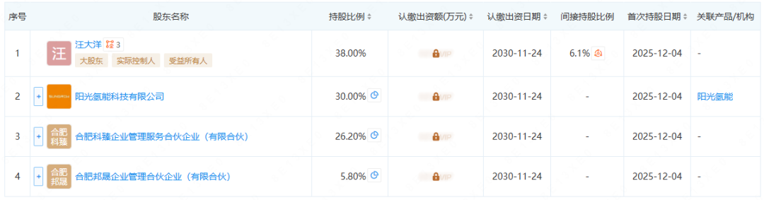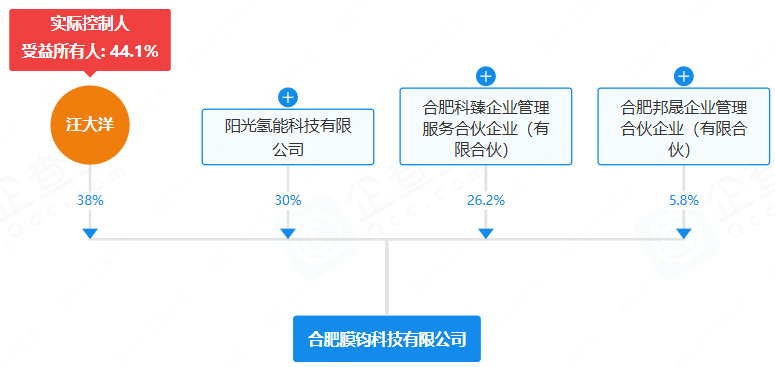 根据股权穿透图显示,汪大洋持股38%,阳光氢能科技有限公司持股30%,合肥科臻企业管理服务合伙企业(有限合伙)持股26.2%,合肥邦晟企业管理合伙企业(有限合伙)持股5.8%。