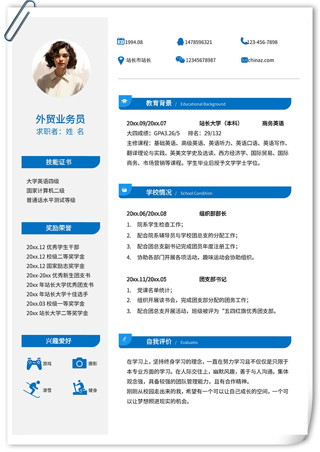 清新商务简洁竞聘简历模板,采用左右双栏的排版布局,以蓝色为主色调,整体界面简洁商务风格,可供参考,主体文字均可替换修改,适用于通用简历、求职简历、个人简历、商务简历、找工作简历、竞聘简历等相关的个人简历主题设计应用。