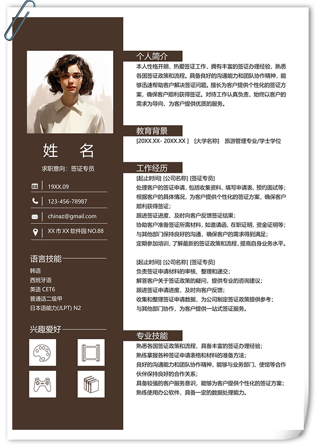 时尚春招应聘个人简历模板,采用左右双栏的排版布局,以咖色为主色调,整体界面简洁商务风格,可供参考,主体文字均可替换修改,适用于通用简历、求职简历、个人简历、商务简历、找工作简历、竞聘简历等相关的个人简历主题设计应用。