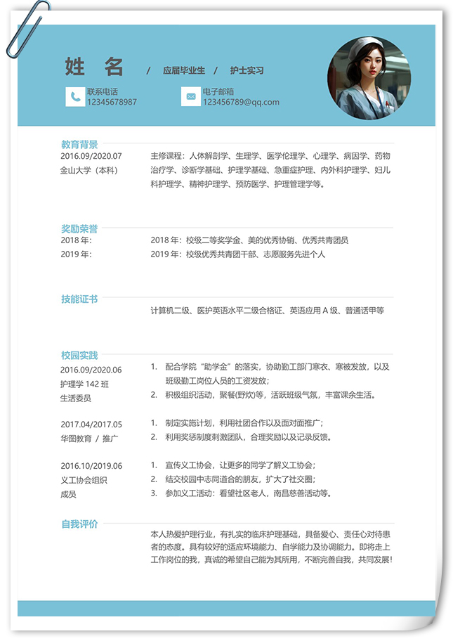 简洁大方应届生个人单页简历,采用纵向单排的排版布局,以浅蓝色色为主色调,整体界面简洁商务风格,主体文字、图标均可替换修改,适用于通用简历、求职简历、个人简历、商务简历、找工作简历、竞聘简历等相关的个人简历主题设计应用。