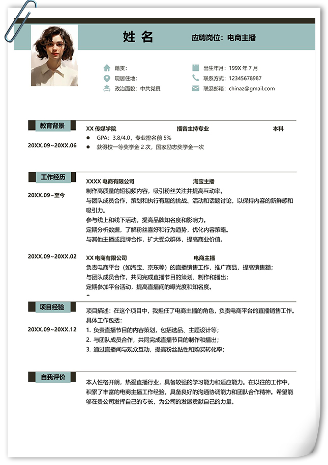 视觉舒适电商主播单页个人简历,采用纵向单排的排版布局,以浅绿色为主色调,整体界面简洁商务风格,简历模板包含了基本信息、教育背景、工作经历、项目经验、自我评价等模块内容,主体文字、图标均可替换修改,适用于市场营销、电商直播、淘宝直播、直播主播、直播销售、电商主播、网红主播等相关的个人简历主题设计应用。