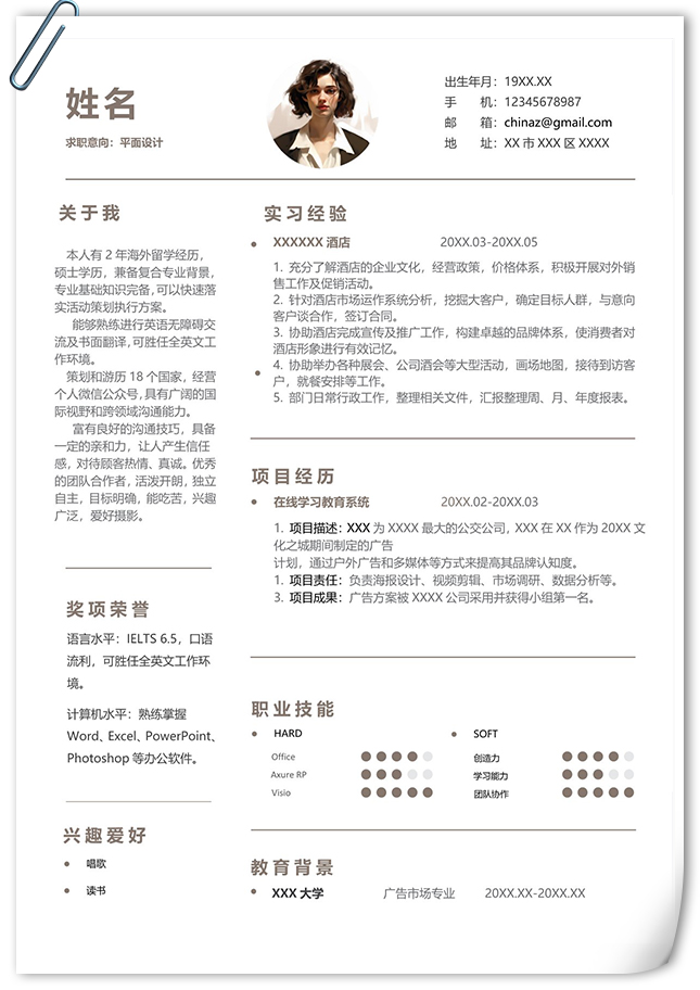 极简平面设计求职简历模板,采用左右双栏的排版布局,以卡其色为主色调,整体界面简洁商务风格,简历模板包含了基本信息、关于我、奖项荣誉、兴趣爱好、实习经验、项目经历、职业技能、教育背景等模块内容,主体文字、图标均可替换修改,适用于艺术设计、广告设计专业、平面设计、网页设计、视觉设计、设计传达、视觉传达视觉、广告设计、平面广告设计、视觉设计师、平面设计师等相关的个人简历主题设计应用。