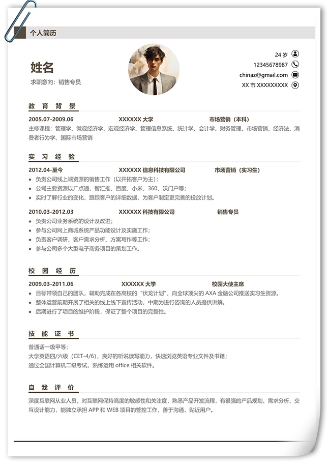 内容清晰销售专员个人简历模板,采用纵向单排的排版布局,以棕色为主色调,整体界面简洁商务风格,模板包含基本信息、教育背景、实习经验、校园经历、技能证书、自我评价等模块内容,可供参考,主体文字均可替换修改,适用于市场营销、市场业务员、销售员、市场营销专业、市场推广、市场业务员、电话销售等相关的个人简历主题设计应用。