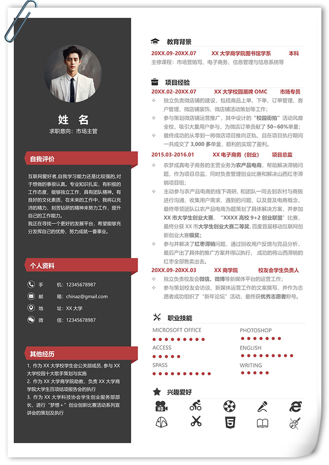 精英职业市场主管单页个人简历,采用左右双栏的排版布局,以深灰色、红色搭配为主,整体界面简洁商务风格,简历模板包含了自我评价、个人资料、其他经历、教育背景、项目经验、职业技能、兴趣爱好等模块内容,主体文字、图标均可替换修改,适用于市场总监、营销总监、运营总监、营销主管、商务管理、区域销售主管、总部销售代表、销售主管、销售总监等相关的个人简历主题设计应用。