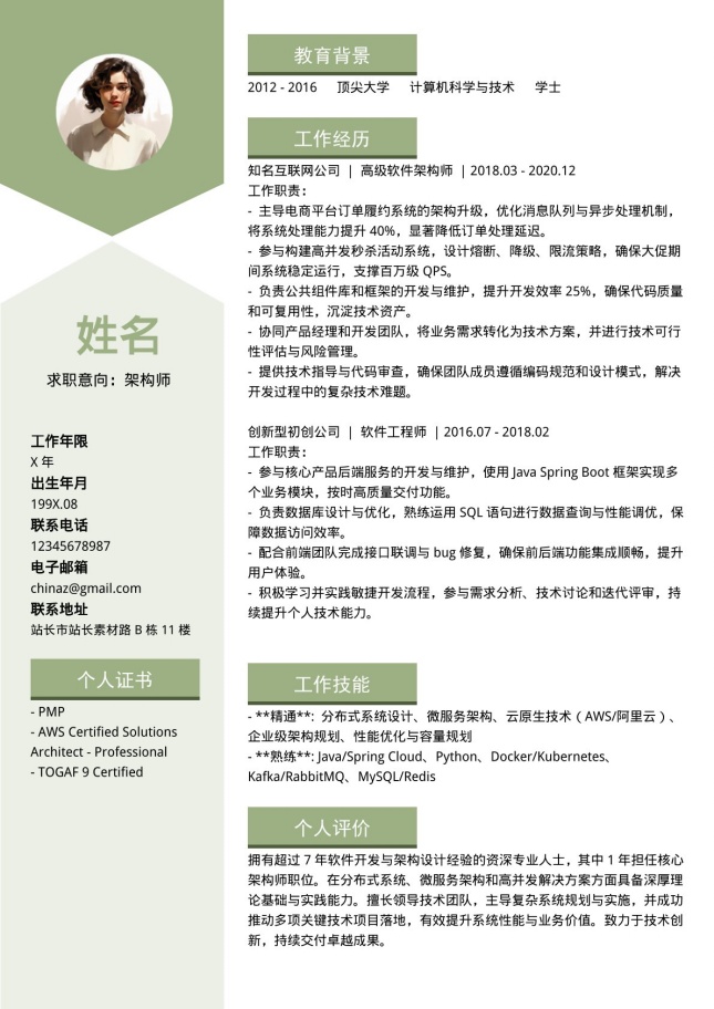 架构师1年经验规范个人简历模板,适用于架构师简历、系统架构简历、技术专家简历、通用简历、求职简历、个人简历、商务简历、找工作简历、竞聘简历等相关的个人简历主题设计应用。