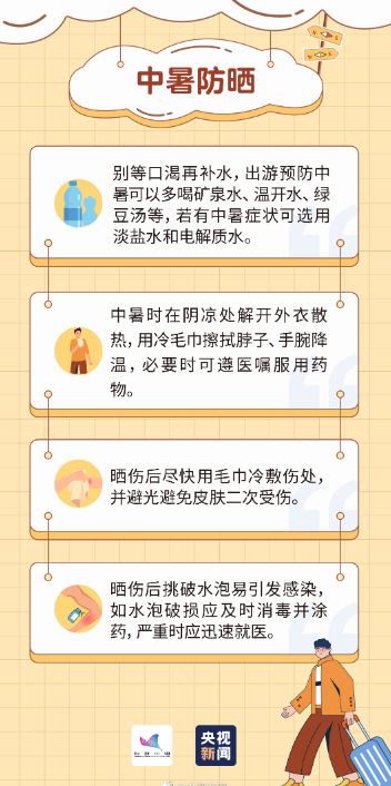 ④出游途中注意防晒防暑,晒伤后尽快用毛巾冷敷,避免挑破水泡。更多请看: