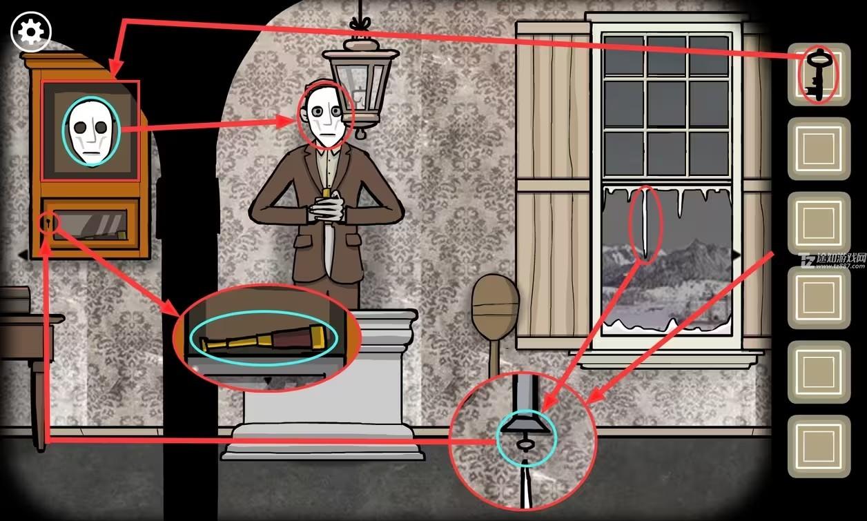 4、用(钥匙)打开存放面具的柜子,获得(白面具);将(白面具)戴到阿尔伯特脸上,窗外开始下雪。