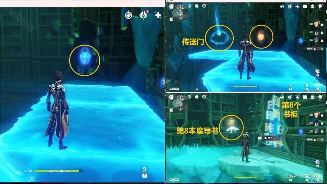 2、从【传送门】飞上去,上面就是第8本【魔导书】和第8个【书柜】。