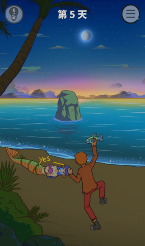 点击树获得绳子,点击草丛海藻,对海使用海藻,对浅滩上的美人鱼使用绳子