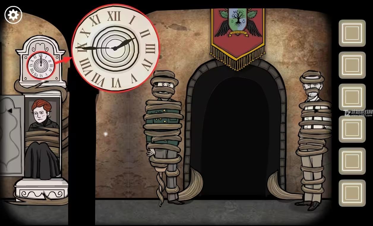 4、点击落地钟,将时间调整到“2:45”,柜门打开后萝丝钻到了落地钟里,被根须缠上后关上了落地钟柜门。