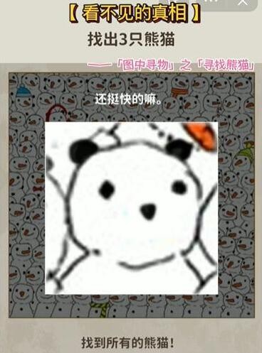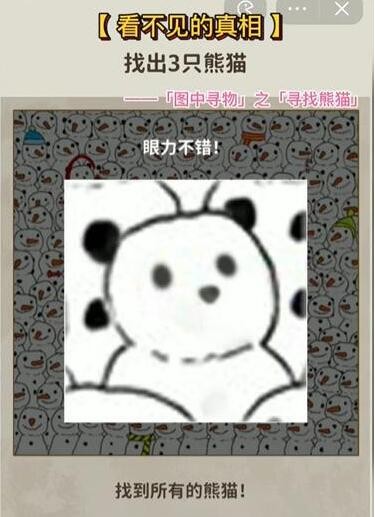 看不见的真相是抖音比较火爆的解谜小游戏,玩家需要根据提示完成推理和解谜,有照片找茬,也有悬疑探案,关卡十分丰富,下面小编带来了寻找熊猫找到三只熊猫这一关的答案分享,快来看看吧!