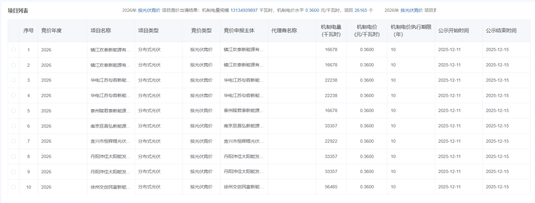 具体见下:全部项目点击跳转链接→江苏省机制电价竞价结果