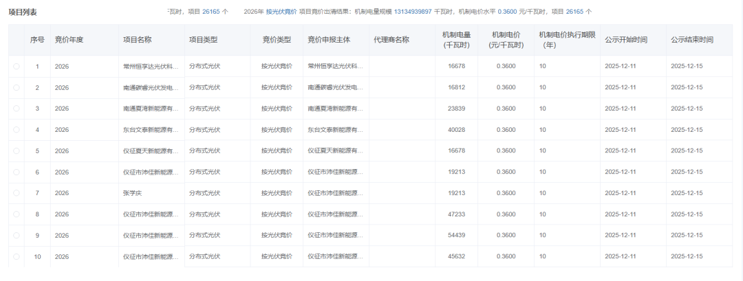 根据公示结果,本次入围机制电量13134939897度,入围项目共26165个,其中集中式光伏项目为105个。