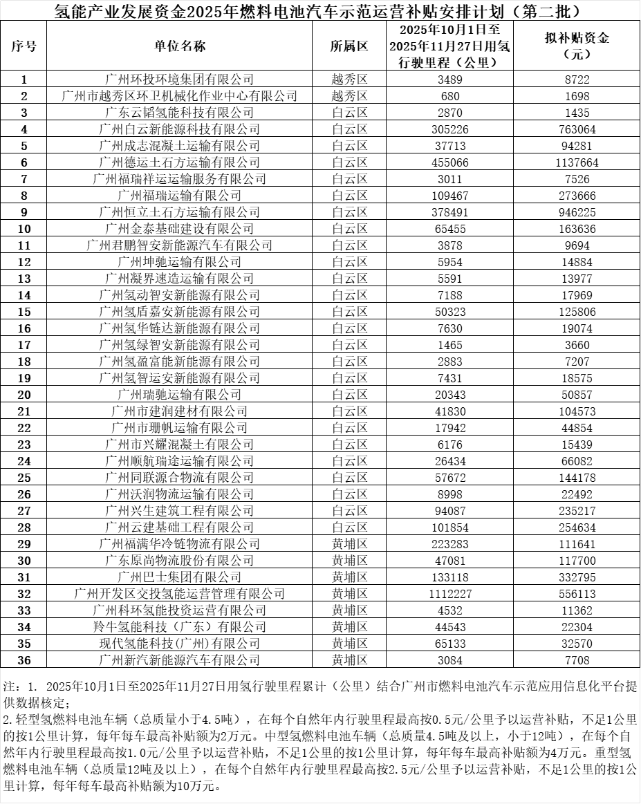 12月12日,广州发改委发布《关于公示氢能产业发展资金2025年燃料电池汽车示范运营补贴安排计划(第二批)的公告》。