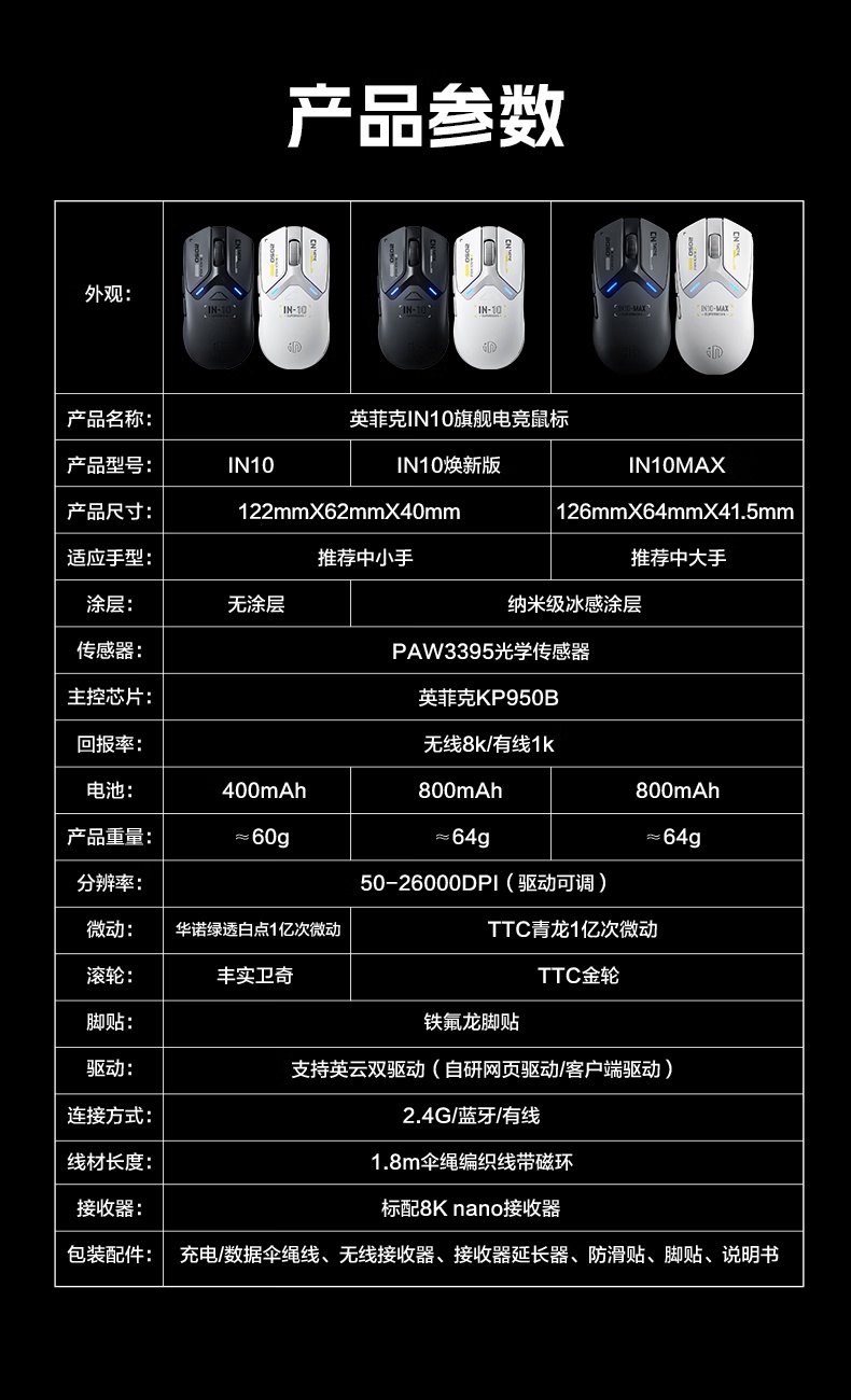 目前官方暂未公布有关这款鼠标的参数信息。查询发现,普通的英菲克 IN10 采用了 PAW3395 光学传感器、华诺绿透白点 1 亿次微动、英菲克 KP950B 主控芯片,配备 400mAh 电池,重约 60g。