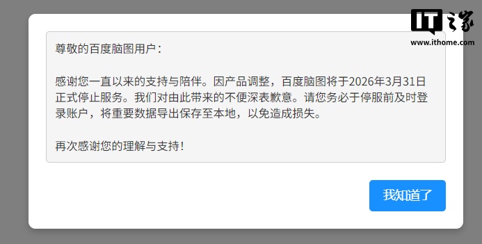 12 月 16 日消息,百度脑图日前发布公告,因产品调整,百度脑图将于 2026 年 3 月 31 日正式停止服务。“我们对由此带来的不便深表歉意。请您务必于停服前及时登录账户,将重要数据导出保存至本地,以免造成损失。”