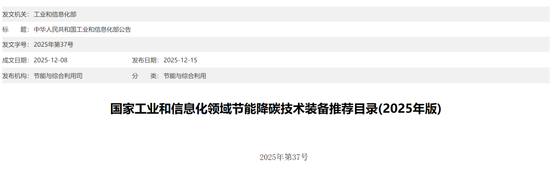 12月15日,中华人民共和国工业和信息化部公告 2025年第37号文发布,公布《国家工业和信息化领域节能降碳技术装备推荐目录(2025年版)》。