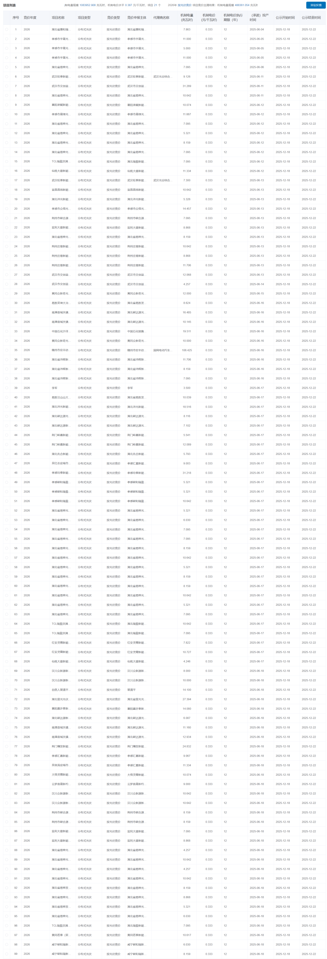 12月18日,国网新能源云公示湖北省2026年新能源机制电价竞价结果,其中光伏0.333元/度,风电0.387元/度。