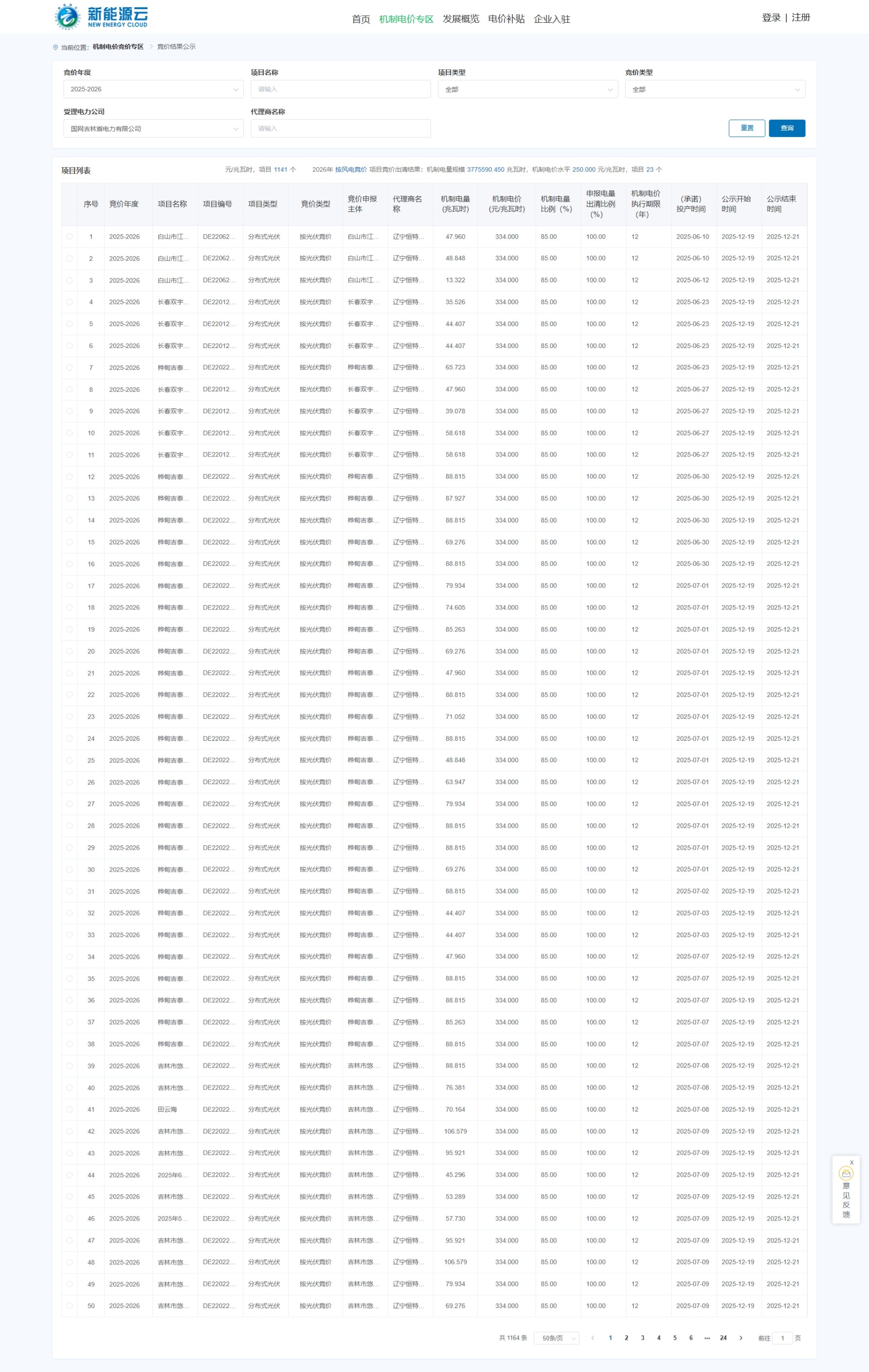 12月19日,国网新能源云公示吉林省首次增量新能源项目机制电价竞价结果,共1164个新能源项目入围。