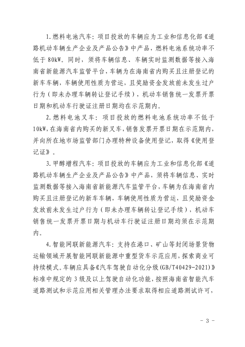 为落实《海南省清洁能源汽车发展规划》《海南省氢能产业发展中长期规划(2023—2035年)》《海南省碳达峰实施方案》等文件精神,根据《海南省2023—2025年鼓励新能源汽车推广应用若干措施》关于支持燃料电池汽车、甲醇汽车等新技术示范应用的要求,现就开展海南省燃料电池汽车及甲醇汽车等技术示范应用项目第二批(2025—2026年)申报工作有关事项通知如下: