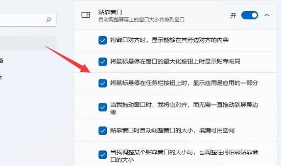 3、展开右边贴靠窗口选项,将下方的选项全部开启,再重启电脑应该就可以了。