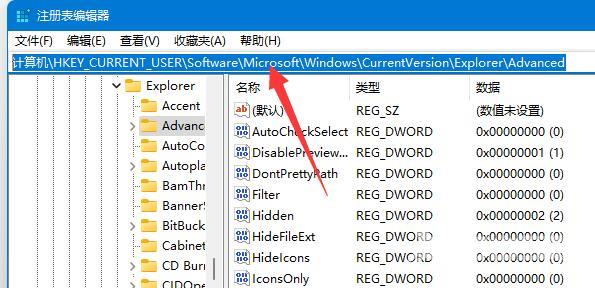 3、进入注册表计算机HKEY_CURRENT_USERSoftwareMicrosoftWindowsCurrentVersionExplorerAdvanced