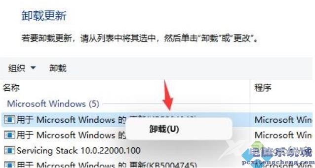 6、卸载更新中,找到有可能引起电脑闪屏的更新,然后点击右键,在打开的菜单项中,选择。