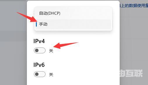 4、将其中的自动(DHCP)改为手动后,开启下方IPv4