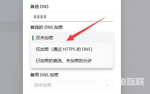 6、然后将首选DNS加密改为仅加密(通过HTTPS的DNS)
