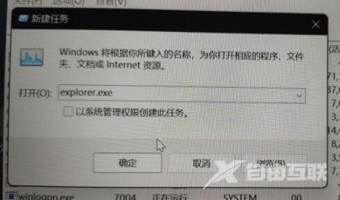 3、接着在其中输入explorer.exe;再点击确定即可。