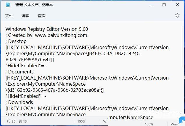 12345678910111213141516171819Windows Registry Editor Version 5.00; Created by: www.baiyunxitong.com; Desktop[HKEY_LOCAL_MACHINESOFTWAREMicrosoftWindowsCurrentVersionExplorerMyComputerNameSpace{B4BFCC3A-DB2C-424C-B029-7FE99A87C641}];HideIfEnabled;=-; Documents[HKEY_LOCAL_MACHINESOFTWAREMicrosoftWindowsCurrentVersionExplorerMyComputerNameSpace{d3162b92-9365-467a-956b-92703aca08af}];HideIfEnabled;=-; Downloads[HKEY_LOCAL_MACHINESOFTWAREMicrosoftWindowsCurrentVersionExplorerMyComputerNameSpace{088e3905-0323-4b02-9826-5d99428e115f}];HideIfEnabled;=-; Music[HKEY_LOCAL_MACHINESOFTWAREMicrosoftWindowsCurrentVersionExplorerMyComputerNameSpace{3dfdf296-dbec-4fb4-81d1-6a3438bcf4de}];HideIfEnabled;=-; Pictures[HKEY_LOCAL_MACHINESOFTWAREMicrosoftWindowsCurrentVersionExplorerMyComputerNameSpace{24ad3ad4-a569-4530-98e1-ab02f9417aa8}];HideIfEnabled;=-; Videos[HKEY_LOCAL_MACHINESOFTWAREMicrosoftWindowsCurrentVersionExplorerMyComputerNameSpace{f86fa3ab-70d2-4fc7-9c99-fcbf05467f3a}]