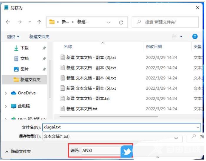 3、另存为这个文件到需要批量修改文件名的文件夹,自定义个文件名,编码要选择为ANSI,再点击保存。