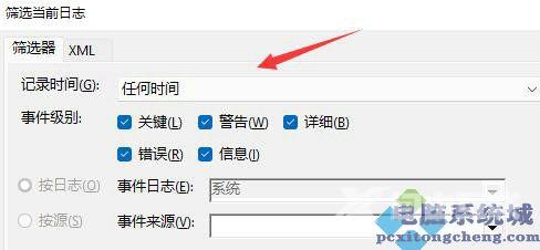 5、进入后将记录时间更改为任何时间,并勾选下方所有的事件级别。