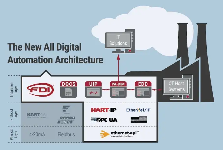 图3:FDI解决了将现场设备与过程工业中使用的大量网络、操作系统和控制系统集成问题。