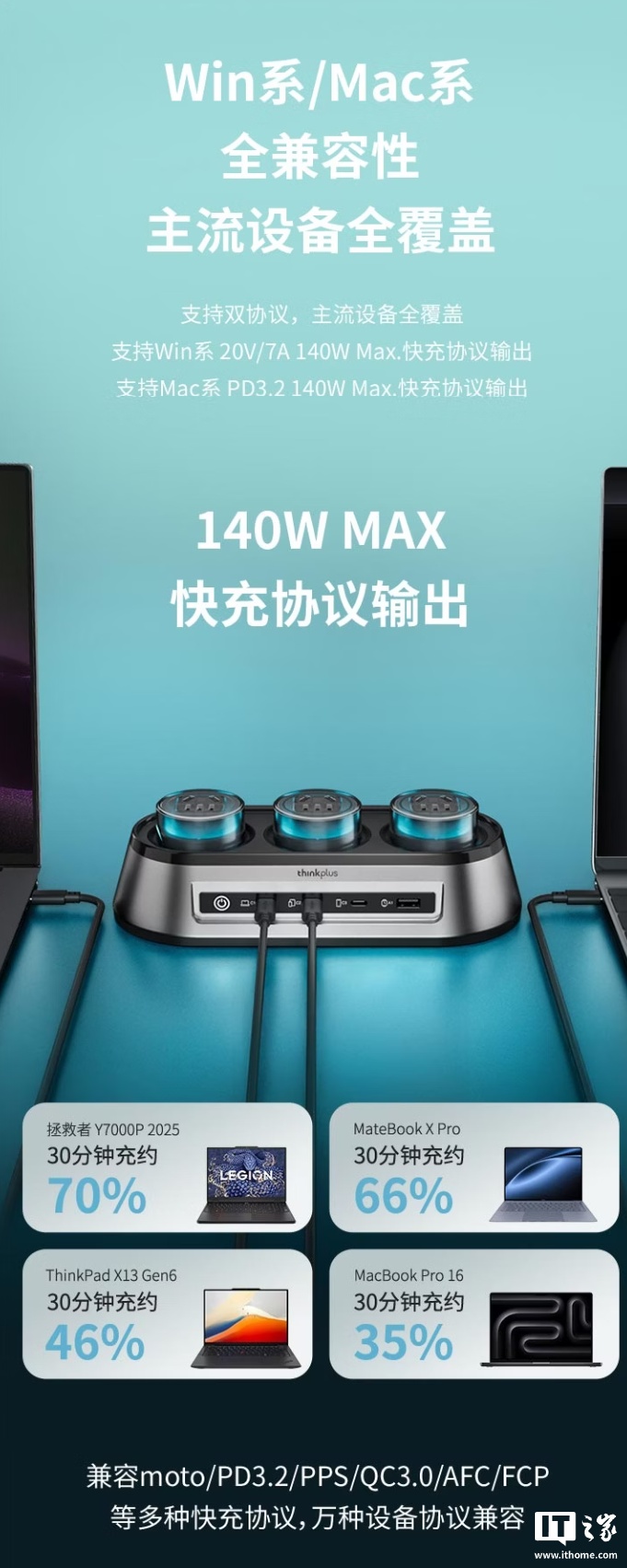 参数方面,这款充电站的 USB-C 接口支持 Win 系笔记本的 20V/7A 140W Max 协议、Mac 系的 PD 3.2 140W Max 协议,可在 30 分钟内为拯救者 Y7000P 2025 款充入 70% 电量,兼容 moto / PD 3.2/PPS/ QC 3.0/AFC/ FCP 等协议,兼容多品牌智能手机 / 平板。