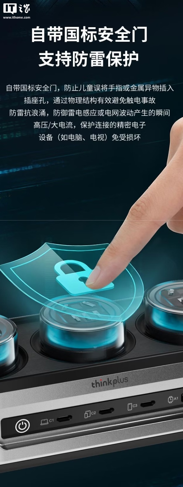 此外,这款充电站还带有新一代 GaN 氮化镓芯片,带有多重安全防护机制,自带国标安全门,可防止异物插入。
