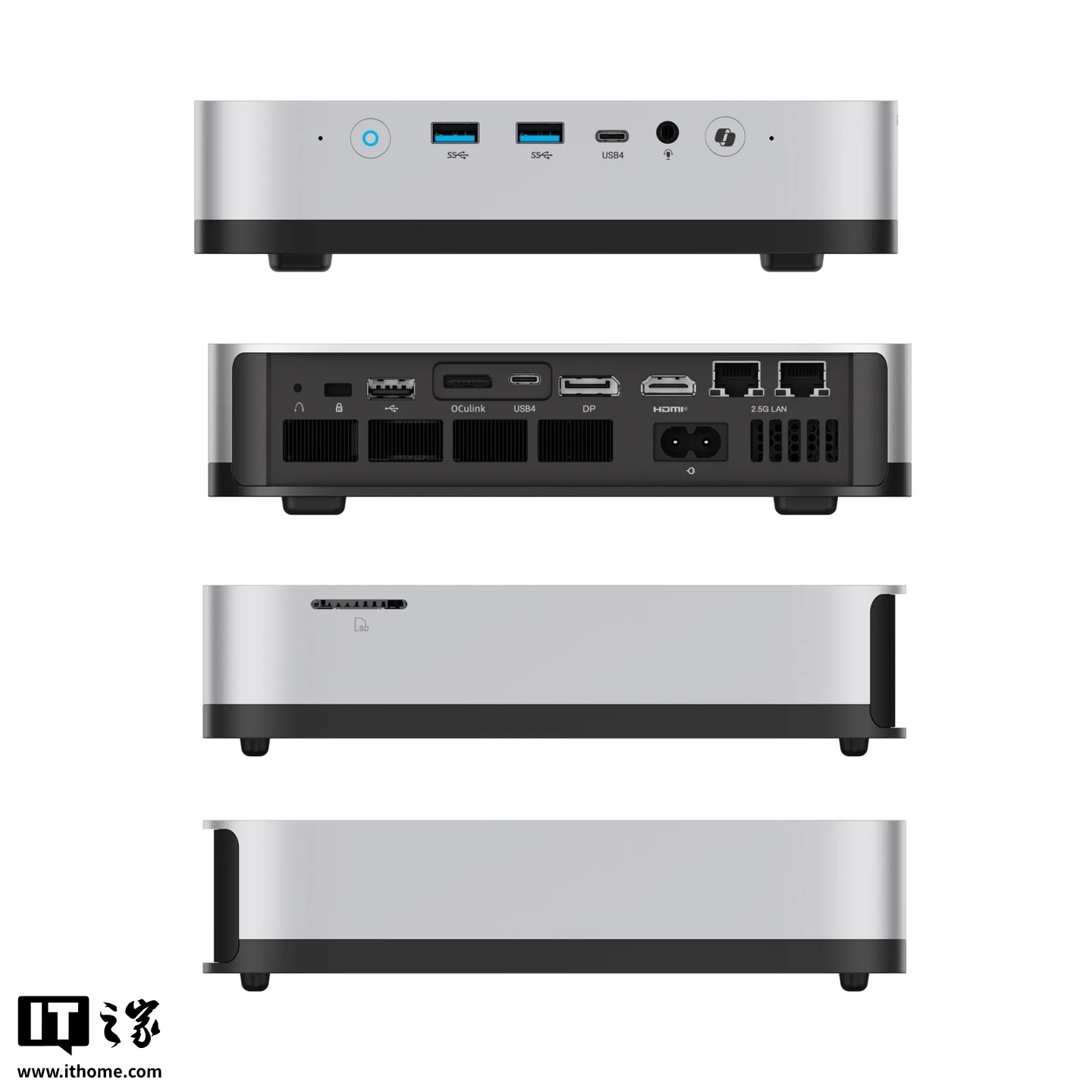 注意到,这款迷你主机最高支持 128GB DDR5 内存,可安装三条 M.2 2280 固态硬盘,机身尺寸为 19.5*19.5*4.8cm,外壳为铝合金材质,内置指纹识别传感器,支持 Windows Hello,配备 DisplayPort 2.0、HDMI 2.1 以及两个 USB-C 接口,最多可连接四台显示器。