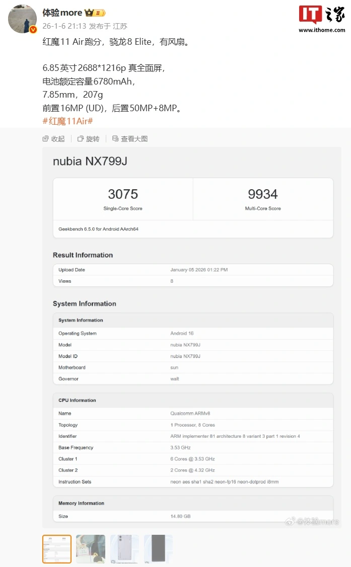 1 月 6 日消息,型号为“nubia NX799J”的红魔 11 Air 新机 Geekbench 跑分已曝光:单核 3075 分、多核 9934 分,博主 @体验more 透露了该机部分配置信息: