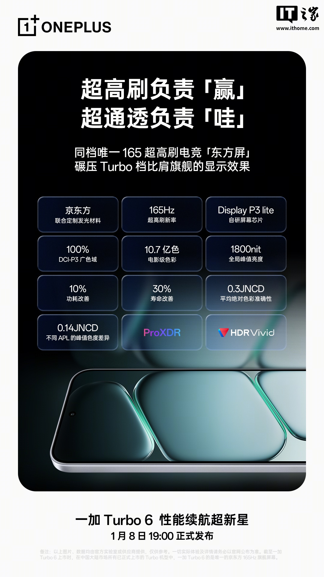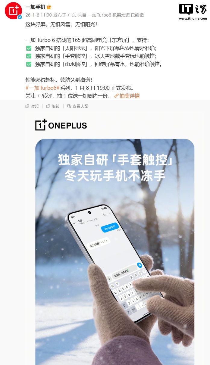 1 月 6 日消息,一加手机正持续预热 Turbo 6 系列手机,根据官方今日公布的最新信息来看,系列新机将搭载 165 超高刷电竞「东方屏」,号称“兼具 165Hz 超高刷新率、比肩旗舰的显示效果、医显共研的明眸护眼”。