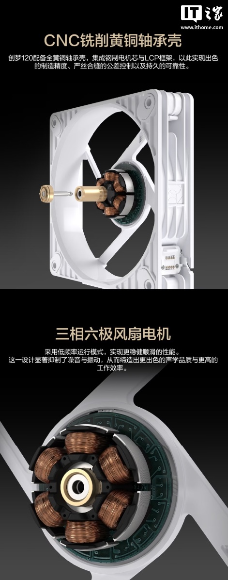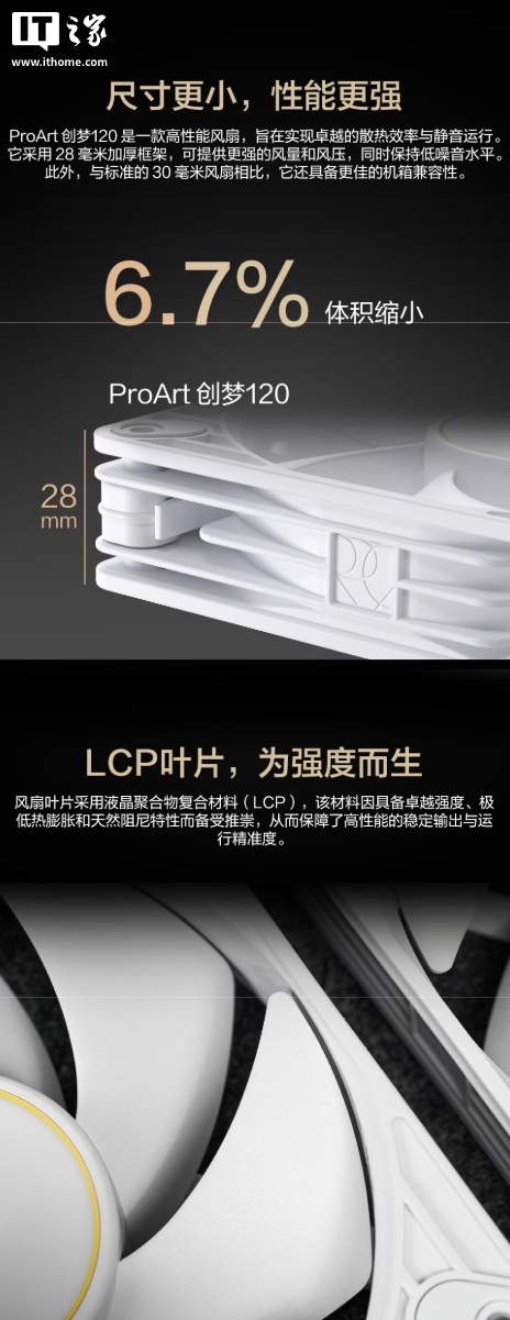 据介绍,这款风扇的厚度是 28mm,相比传统的 30mm 风扇能提供更佳机箱兼容性,叶片采用液晶聚合物复合材料(LCP),保障高性能稳定输出与运行精确度,配备全黄铜轴承壳,集成钢制电机芯与 LCP 框架,号称可实现“持久可靠性”。
